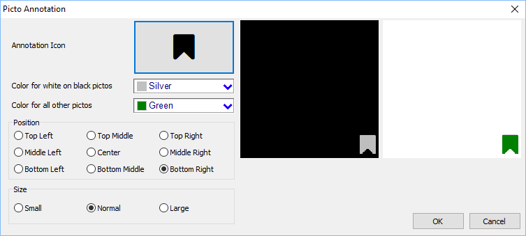 - Custom - a icon can be selected and shown in one of the corners of the picto using a selected color and size