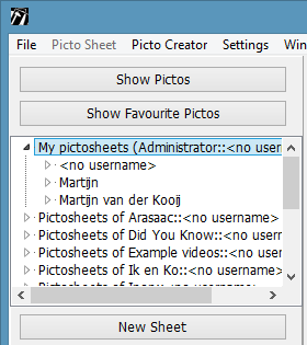 In the pictosheet list the Windows logon name is used and only sheets created by the current Windows logon name and without a name will be visible.